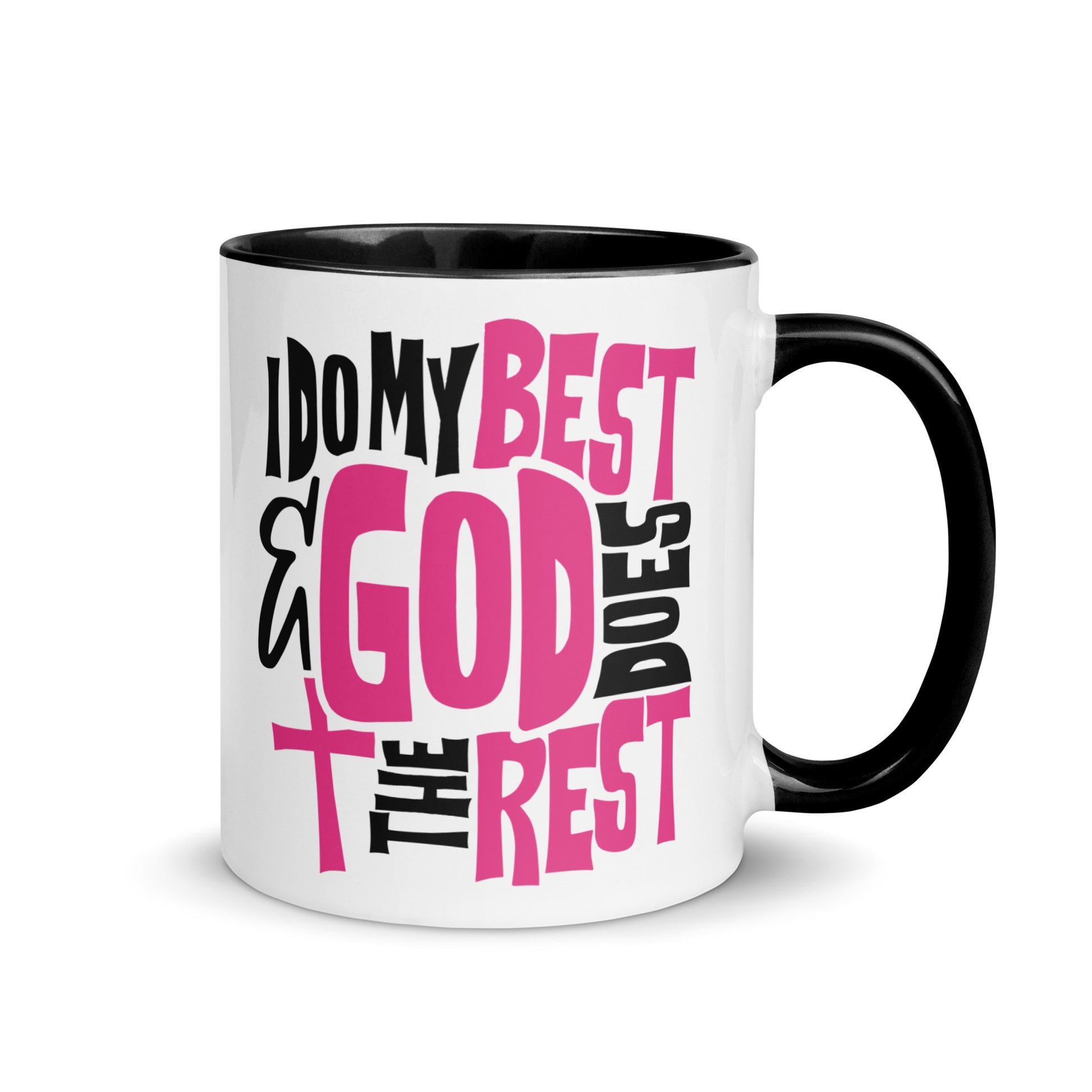 Encouraging phrase on both sides of mug: "I do my best and God Does the Rest" accented with a Cross as a powerful reminder.